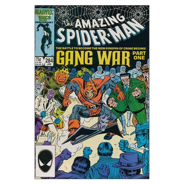Gang War: Part 1 of 5 -- "And Who Shall Stand Against Them...?" Plot by Tom DeFalco. Script by Jim Owsley. Art by Ron Frenz (layouts), Brett Breeding (pencils), and Joe Rubinstein (inks). Cover by Ron Frenz. The Kingpin has left New York! And now every crime boss, large or small, is vying for the top spot in the Big Apple! It's a bloodbath in the streets as the Hobgoblin, Rose, Jack O'Lantern, Hammerhead, Silvermane, and the Arranger battle for supremacy! And of course your friendly neighborhood Spider-Man is caught in the crossfire! But this gang war is so big, the web-slinger may get help from other super-heroes (or anti-heroes)...whether he wants it or not!