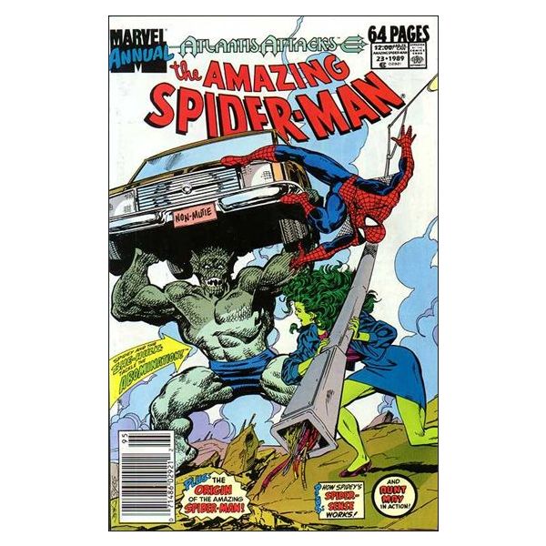 "Abominations!" Guest-starring She-Hulk. Part 4 of the Atlantis Attacks storyline. Plot by Gerry Conway. Script by David Michelinie. Pencils by Rob Liefeld. Inks by Tim Dzon, James Brock, Vince Mielcarek, and Keith Williams. Cover by John Byrne. Lord Ghaur, Llyra, and Tyrannus descend on Manhattan for the next phase of their diabolical plot to subjugate the Earth! Their plan to create death and destruction is simple: unleash the deranged Abomination on the helpless citizens of New York City! Fortunately though, two super-heroes close by hear the ruckus and answer the call for help! Spider-Man and She-Hulk! Wow, can they stop one of the Hulk's greatest foes? On the east side waterfront, the web-slinger and She-Hulk throw down with determination against the Abomination! Katie bar the door! The Atlantis Attacks storyline continues in Punisher Annual 2. Cameo appearances by Mary Jane Watson, Flash Thompson, Aunt May, Lance Bannon, Clark Kent, J. Jonah Jameson, the Viper, and the Kingpin. First backup story: Re-telling of Spider-Man's origin in "My Science Project." Script by Gerry Conway. Pencils by Mark Bagley. Inks by Mike Esposito. Second backup story: "Standards of Behavior" Script by Gerry Conway. Pencils by Richard Rockwell. Inks by Andy Mushynsky and Don Hudson. Aunt May tangles with sleazy photographer Nick Katzenberg. Third backup story: "Cataclysm" Story by Peter Sanderson. Pencils by Mark Bagley. Inks by Keith Williams. Chapter 4 of the Saga of the Serpent Crown. First backup feature: "Spider-Man's Uncanny Spider-Sense" Script by Tom DeFalco. Pencils by Ron Frenz. Inks by Chris Ivy. 3-page illustration of how the web-slinger's spider-sense works. Second backup feature: "Spider-Man's Top 30 Villain Countdown! Script and art by Fred Hembeck. Third backup feature: "Spider-Man versus J.J.J.! Script and art by Fred Hembeck. 3-page illustration of the long-running feud between the wall-crawler and J. Jonah Jameson. 64 pages.