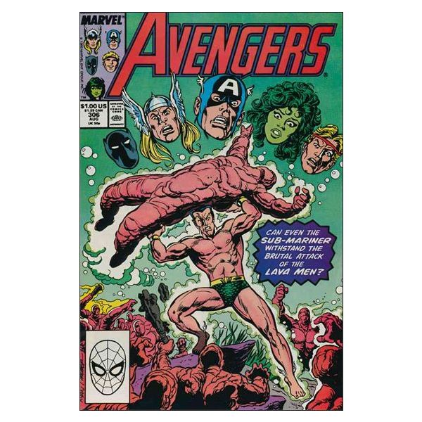 "There is a Fire Down Below" Part 2 of 3. Script by John Byrne. Art by Paul Ryan (breakdowns) and Tom Palmer (finishes). Cover by Paul Ryan and Tom Palmer. While swimming into Upper New York Bay, the Sub-Mariner is ambushed by a legion of Lava Men! However, Prince Namor has plenty of company at the bottom of the bay! Namely his fellow avengers! Trapped within a rocky sphere, the Avengers desperately try to break free before suffocating! Thanks to the Prince of Asgard, Earth's Mightiest Heroes and the Avenging Son escape their undersea prisons! But then they find themselves in the subsurface lair of Jinku…staring at a giant lava monster! Meanwhile as Hydro-Base teeters on the brink of plunging into the bay, Jarvis sends a distress call to the Avengers' west coast branch! Cameo appearance by the West Coast Avengers.
