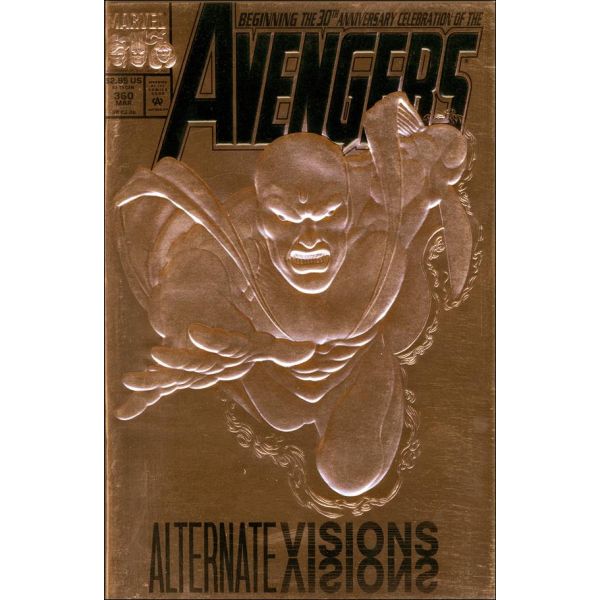 The Gatherers Saga: Part 10 of 18 - "Alternate Visions" Script by Bob Harras. Pencils by Steve Epting. Inks by Tom Palmer. Bronze foil embossed cover by Steve Epting and Tom Palmer. Inside the citadel of the Gatherers, Proctor holds his newest avenger captive! The Vision! What diabolical plan does Proctor have in store for the synthezoid avenger? A simple one really. Transplant the Vision's artificial mind into another Vision from an alternative reality! And send the new "evil" Vision to kill the Avengers! A synthetic wolf in sheep's clothing! With Earth's Mightiest Heroes in disarray (after Sersi's rash behavior last issue), will the Vision's teammates even notice the change? First appearance of the Anti-Vision. Cameo appearances by Captain America, Lockjaw, and the Swordsman. Backup feature: "Overviews" Script by Bob Harras. Art by Hector Collazo. Designs by Suzanne Gaffney. The Black Widow brings Cap up-to-date on everything he's missed with the Avengers over the past several weeks.