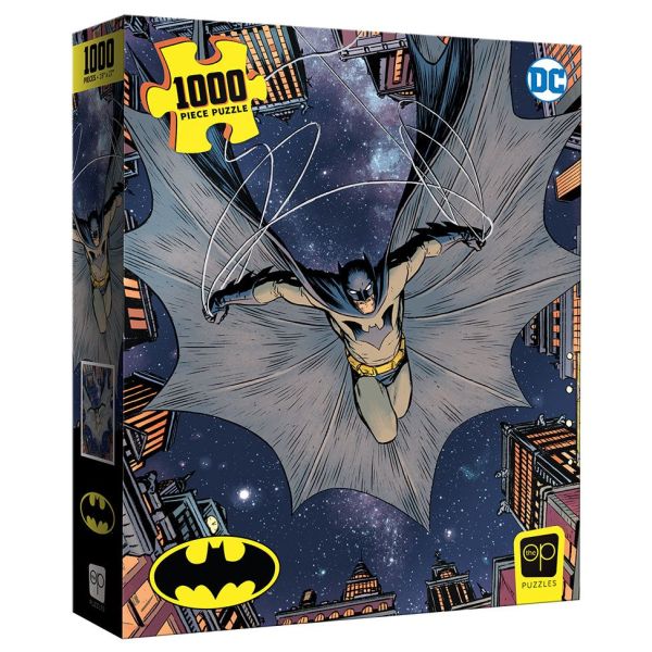 A fierce and unfurled Batman descends from Gotham City heights in this 1,000-piece jigsaw puzzle featuring a retro comic-style Caped Crusader centered amidst towers and a starry sky.