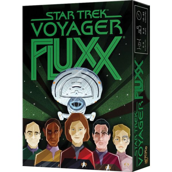 Journey home from the Delta Quadrant aboard the Starship Voyager! In this fourth Fluxx excursion into the Star Trek universe Captain Janeway and her crew will encounter familiar enemies: The Kazon, Species 8472, and of course, the Borg. The classic ever-changing rules of Fluxx are further enhanced by twists like the Caretaker and Ancestors` Eve. Janeway from the future might even show up in a Timeship!