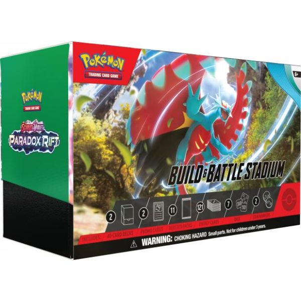 Build two decks with a friend - and then play right away! This Pokemon TCG: Scarlet & Violet - Paradox Rift Build & Battle Stadium contains a massive set of cards, including two Build & Battle Boxes. Each Build & Battle Box contains four booster packs and a 40-card deck that includes an exclusive foil card. You can play these decks right out of the box or enhance them with cards from the booster packs. Get ready to face your opponents in the Build & Battle Stadium!