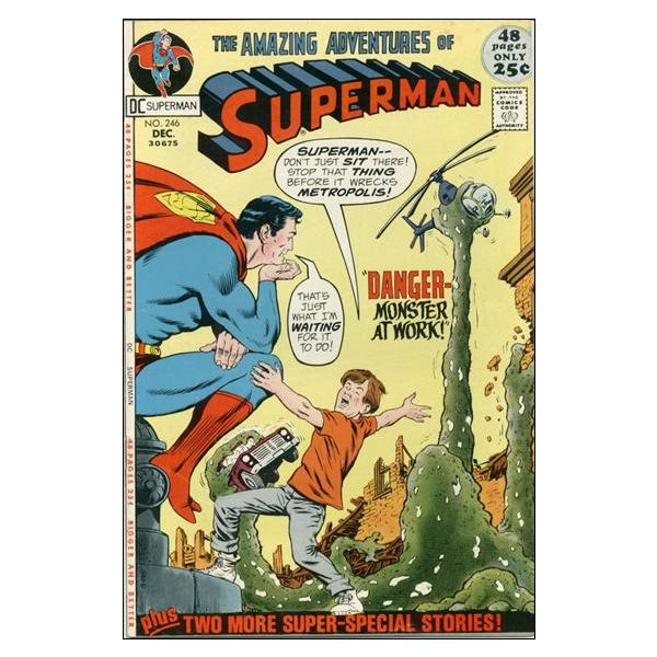 Cover pencils by Curt Swan, inks by Murphy Anderson. Danger--Monster At Work! starring Superman, script by Len Wein, pencils by Curt Swan, inks by Murphy Anderson; intro of S.T.A.R. Labs. Marriage, Kryptonian Style!--Fabulous World of Krypton starring Superman, Jor-El, and Lara, script by Cary Bates, pencils by Rich Buckler, inks by Murphy Anderson. There Is No Superman!, script by Jerry Siegel, art by Ira Yarbrough. 52 Pages