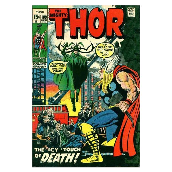 Cover pencils by John Buscema, inks by Frank Giacoia. "The Icy Touch of Death!", script by Stan Lee, pencils by John Buscema, inks by Joe Sinnott; In revenge over her defeat of Infinity, Hela has targeted Thor as her next victim, much to the shock and display of everyone gathered; Odin, appealing to his son's wish to escape this fate, orders Thor to return to Earth and return to his mortal guise of Donald Blake, a being that Hela has no claim on; Furious that he must abandon his godly form in order to continue his existence, Thor agrees and departs for Earth; While in Hel, Hela questions why people fear her touch when it can bring them such peace; Her thoughts are interrupted by Loki, who has entered into her realm to tip her off on Thor's whereabouts. Appearances by Sif, Balder, Hogun, Fandral, Volstagg, and Karnilla. Heimdall cameo. 36 pgs., full color